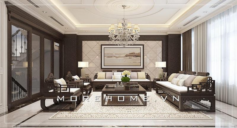 Sofa phòng khách được thiết kế bằng gỗ óc chó kết hợp với bọc nỉ màu nâu sang trọng để tạo nên một phong cách biệt thự tân cổ điển.